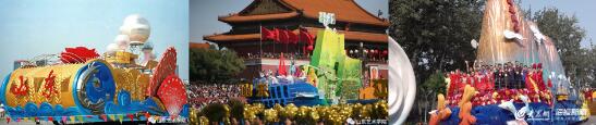 國(guó)慶50周年山東彩車“海上明珠”(左一),國(guó)慶60周年山東彩車“岱青海藍(lán)”(左二),國(guó)慶70周年山東彩車“國(guó)泰民安”(右一)