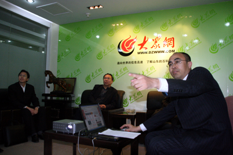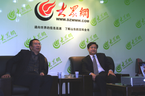 國務院新聞辦副主任王國慶(左)在山東省委宣傳部副部長劉保聚陪同下聽取大眾網工作匯報