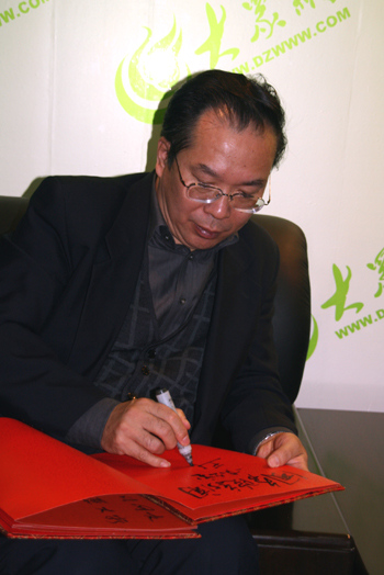 大眾網總編輯潘子江(右一)向王國慶匯報工作,山東省外宣辦副主任楊曉洲(左一)陪同。