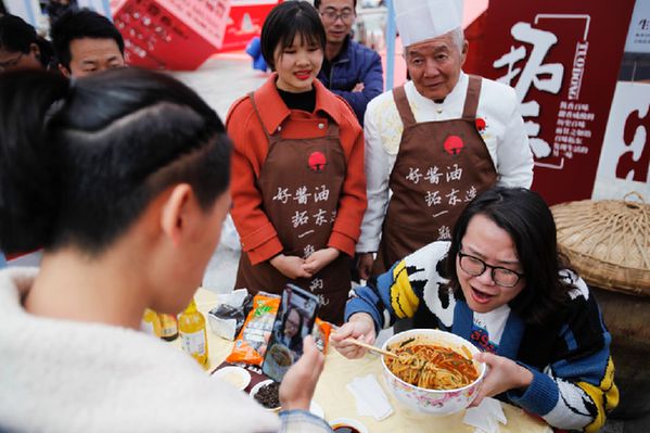 “云南的小鍋米線,這個可和過橋米線完全不一樣哦,煮這個必須要用小銅鍋,還要加入特色的拓東醬油,味道特別濃厚!”在鏡頭前,大胃浪胃仙抬著一碗由云南省餐飲與美食行業協會副會長、元老級注冊中國烹飪大師、中國滇菜飲食文化大師蔣彪在現場親手烹煮的小鍋米線,大快朵頤,不亦樂乎,一邊與鏡頭另一端的粉絲們熱情互動,引來現場眾多市民爭相圍觀。