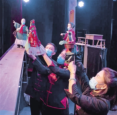 晉江市掌中木偶劇團(tuán)原創(chuàng)短劇《親姆拜年》,圖為演員在操縱木偶表演中。資料圖片