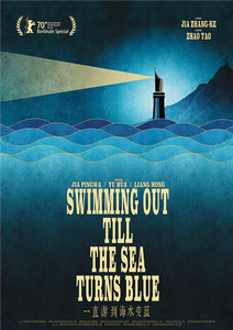 賈樟柯自己的作品《一直游到海水變藍》則進入了本屆柏林電影節的特別展映單元。開幕當天,這部紀錄片在電影節進行了全球首映,片方同時公布了一款國際版海報,海浪中如燈塔般放光的鋼筆筆尖表達了“過去是照亮今天的燈塔”這一主旨。這款海報的創作者是著名設計師黃海,賈樟柯過去的作品《山河故人》和《江湖兒女》也跟他合作過。