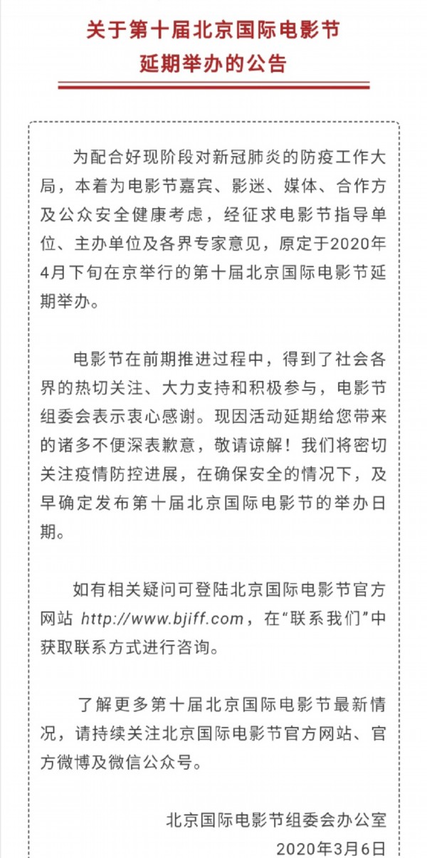 3月6日晚,北京國(guó)際電影節(jié)官方微博發(fā)布公告,為配合好現(xiàn)階段對(duì)新冠肺炎的防疫工作大局,本著為電影節(jié)嘉賓、影迷、媒體、合作方及公眾安全健康考慮,經(jīng)征求電影節(jié)指導(dǎo)單位、主辦單位及各界專家意見,原定于2020年4月下旬在京舉行的第十屆北京國(guó)際電影節(jié)延期舉辦。
