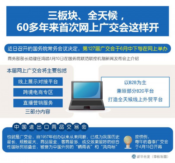 新華社北京4月10日電(陳煒偉、戴小河)近日召開的國務院常務會議決定,第127屆廣交會于6月中下旬在網上舉辦。商務部部長助理任鴻斌10日介紹,本屆網上廣交會將主要包括線上展示對接平臺、跨境電商專區、直播營銷服務三部分內容,以B2B為主,兼顧部分B2C平臺,打造全天候線上外貿平臺。