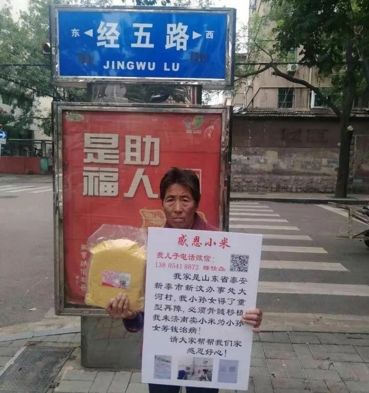 李奶奶每天會拿著救孫女的牌子在路邊賣小米籌錢