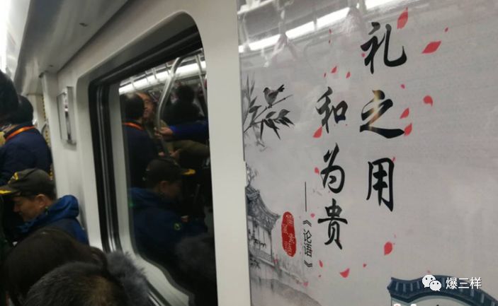 在泉字車頭的地鐵車廂里,傳統文化元素隨處可見,每節車廂里都掛有精選的《論語》,超然樓、大明湖等泉城元素的圖案也體現在車門上。