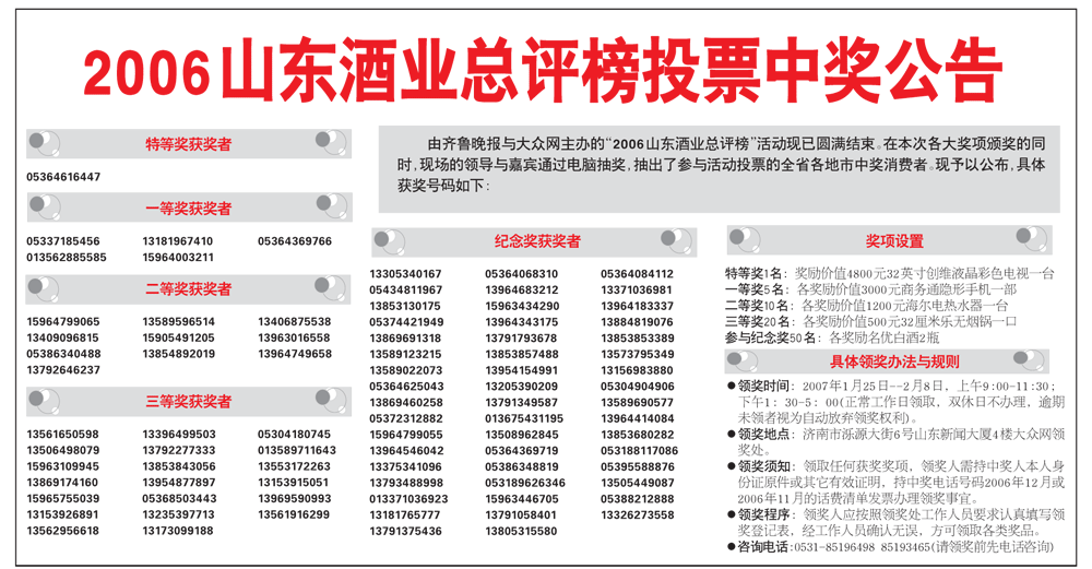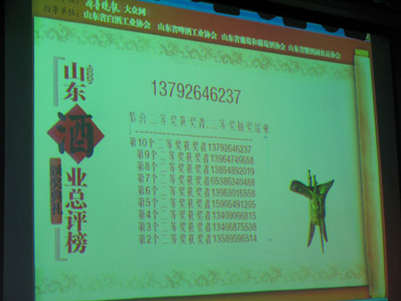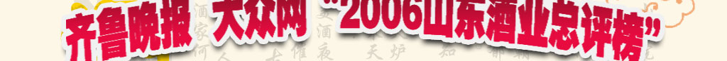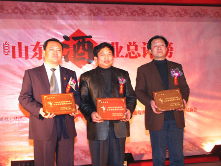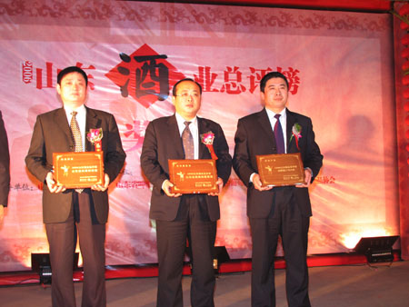 “山東酒業(yè)卓越品牌” ——青島啤酒 “山東經(jīng)典商務(wù)葡萄酒” ——華東葡萄酒 “山東經(jīng)典商務(wù)啤酒” ——琥珀啤酒 “山東酒業(yè)消費(fèi)者人氣大獎(jiǎng)” ——扳倒井酒 “山東十大名酒”(排名不分先后) 泰山特曲 蘭陵王酒 景芝景陽春酒 趵突泉酒 古貝春酒 扳倒井酒 景陽岡酒 花冠酒 禹王亭酒 孔府家酒 “山東酒業(yè)競(jìng)爭(zhēng)力品牌” 百脈泉酒 彩山特曲 洛北春酒 “山東暢銷外地名酒” (排名不分先后) 水井坊酒 舍得酒 口子窖酒 小糊涂仙酒 酒都春酒