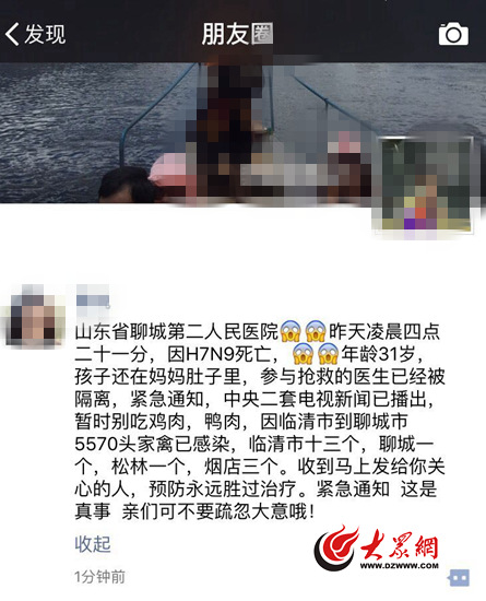 今年1月,一則“聊城臨清孕婦感染H7N9禽流感病毒死亡”的消息在網上流傳。消息言之鑿鑿地說:“一位女性患者昨天凌晨四點二十一分在聊城第二人民醫院死亡,病因是H7N9禽流感,該患者年齡31歲,孩子還在肚子里。”該消息還聲稱“參與搶救的醫生已經被隔離”,提醒市民“暫時別吃雞肉鴨肉,臨清市到聊城市的5570頭家禽已被感染。感染人數聊城一個,松林一個,煙店三個”。不僅如此,為了吸引眼球,該消息稱疫情“已經由央視二套電視新聞播出”。