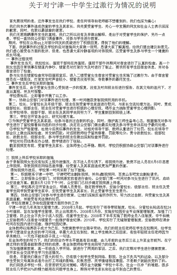 下面,我就事件的過程及學校的應對措施向大家做一說明,懇請大家了解真相,給我們提出建議和意見。我們虛心接受各方面的批評,但是,也懇請大家冷靜客觀的對待視頻,還受害學生及參與學生一個健康的成長環境。