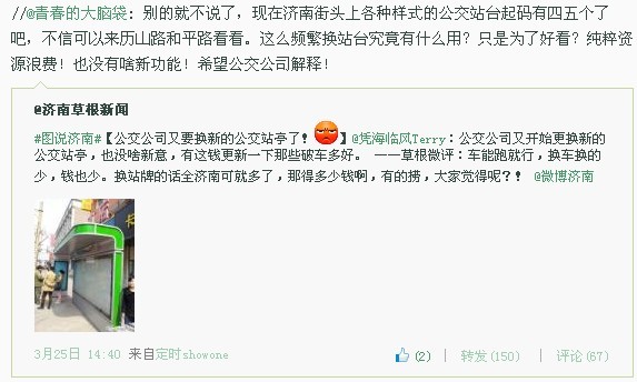 近日,網友“憑海臨風Terry”將新候車廳的照片傳到微博上,并評論:“公交公司又開始更換新的公交站亭,也沒啥新意,有這錢更新一下那些破車多好。”博文在經微博名人“濟南草根微博”轉發(fā)后,迅速引起了數百網友的大討論。