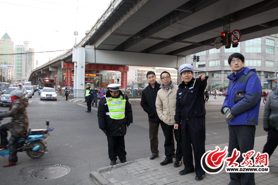 在經四路和順河東街十字路口北側,委員和網友代表在交警的引導下,調研該路段卡脖子路導致擁堵的解決辦法。