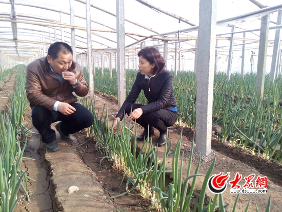 章丘繡惠種蔥大戶趙建剛(左)在檢查大棚蔥的情況。他盼望能成立大蔥協(xié)會,來對抗蔥販子的壓價。(記者 王宗陽 攝)