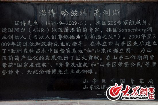 “有一位德國友人叫諾博,是德國葡萄專家,2000年至2009年間他同助手漢斯17次來到中國山東棗莊,向當地農民傳授葡萄栽培、嫁接改優技術,將傳承幾百年的家族商標無償授予當地酒廠使用。諾博和漢斯資助了8名當地家庭經濟困難學生上學。2007年,漢斯突患癌癥,彌留之際仍不忘自己資助的兩名學生尚未念完高中,囑托諾博把2000元助學款帶給他們。2008年8月1日,當諾博把錢交到孩子手中時,在場的所有人都感動得潸然淚下。”
