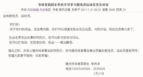 21日上午,一條名為“市體育局局長(zhǎng)李慶豐尋求與教練員運(yùn)動(dòng)員實(shí)名對(duì)話”的帖子出現(xiàn)在了大眾網(wǎng)德州論壇,并引起網(wǎng)友關(guān)注。這條署名為“德州市體育局局長(zhǎng)李慶豐”的帖子內(nèi)容也簡(jiǎn)單明了:“全體教練員、運(yùn)動(dòng)員:你們好!關(guān)于你們的獎(jiǎng)金、生活費(fèi)問(wèn)題,你們可以用真實(shí)姓名在論壇里,與我對(duì)話。我在此恭候大家了。社會(huì)各界關(guān)注此事的網(wǎng)民們,也可以參與咨詢與討論。也可以打電話、發(fā)短信給我。我會(huì)一一做出解答。”帖子最后,發(fā)帖者還公開(kāi)了自己的辦公電話和手機(jī)號(hào)碼。