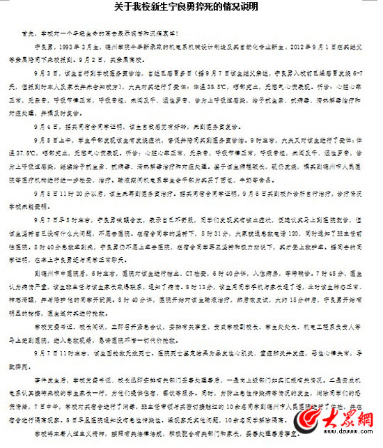 9日晚,德州學院對大一新生寧良勇猝死事件向大眾網作出回應,詳細說明了寧良勇在校7天的具體情況,并對寧良勇的離去表示惋惜和沉痛哀悼。校方稱,寧良勇入校前已經感冒發燒6-7天,學校曾懇請醫院不惜一切代價搶救。學校將本著人道主義精神,按照有關法律法規,積極配合有關部門和家長,妥善處理善后事宜。