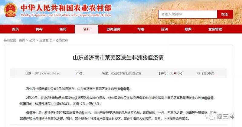 農業農村部新聞辦公室2月20日發布,山東省濟南市萊蕪區發生非洲豬瘟疫情。2月20日,農業農村部接到中國動物疫病預防控制中心報告,經中國動物衛生與流行病學中心確診,濟南市萊蕪區某養殖場發生非洲豬瘟疫情。截至目前,該養殖場存欄生豬4504頭,發病17頭,死亡3頭。