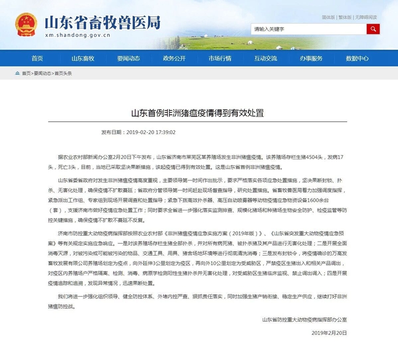 20日下午,大眾網·海報新聞記者從山東省畜牧獸醫局了解到,山東省防控重大動物疫病指揮部辦公室通報稱,目前,當地已采取堅決果斷措施,該起疫情已得到有效處置。這是山東省首例非洲豬瘟疫情。
