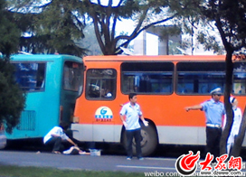 “兩公交發生追尾,兩車之間有大片血跡和一把雨傘……很血腥,傷者應該已被救護車拉走。”隨后,更多網友開始發表關于此交通事故的微博并上傳了現場照片。在網友上傳的一張照片中,記者看到,兩輛公交車依次停在路邊,距離很近,一位年輕女子躺在兩車中間的馬路上,另有一名女子蹲在旁邊查看其受傷情況。在網友的另一張圖中,一位公交車司機摸樣的女子面對記者鏡頭扭頭掩面,被撞的女子平躺在地上,身下有一灘血跡。