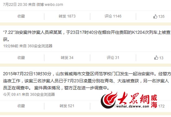 7月23日18時許,“文登警方在線”官方微博發布消息,“7·22”治安案件涉案人員梁某某,于23日17時40分在煙臺開往貴陽的K1204次列車上被查獲。