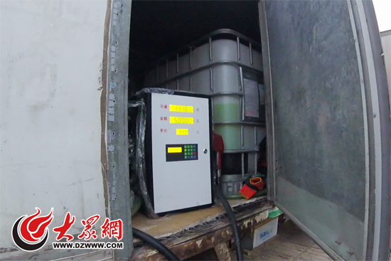 在轉盤北150米路東、緊鄰大濟路不足一米的地方,一家經營工程車的小院子里,大眾網記者又發現了兩輛帶集裝箱的小貨車,小貨車整個車身貼滿啤酒宣傳廣告作為偽裝,從小貨車上集裝箱的門縫里,能清楚地看到儲存柴油的塑料罐和加油機。在得知記者有多輛車需要加油時,老板介紹說,他的兩個集裝箱分別裝有售價每升4.48元的0#柴油和售價每升4.62元的-10#柴油,都比市場價便宜許多。