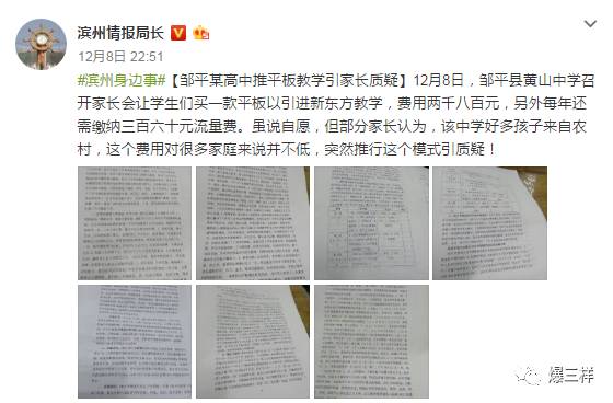 12日,有網友反映,濱州鄒平縣黃山中學推廣平板教學,以“家長自愿”的名義,讓學生購買特制平板電腦、支付網絡流量費等,共計收費2800元。