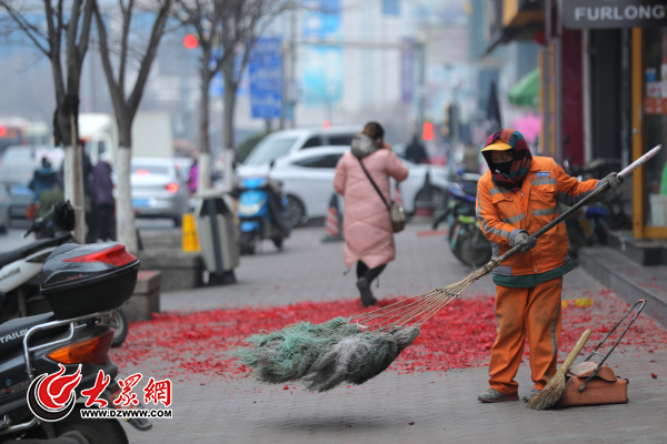 2月3日農歷正月初七,濟南環衛工人在清理“開門炮”碎屑。記者 王長坤 攝