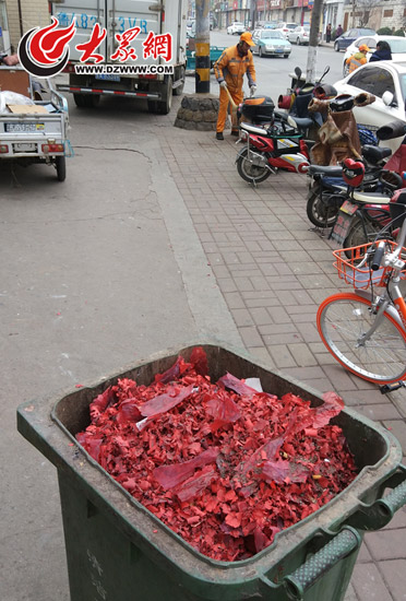 今年不僅“開門炮”的鞭炮皮數量有所減少,整個春節假期濟南市內五區環衛部門清理的鞭炮皮也明顯減少。在市中區舜耕路中段,負責打掃舜玉小區的一名環衛工人向大眾網記者介紹說,今年春節假期的鞭炮皮比去年減少了一半左右:“今年初一我裝了一桶半,去年初一可是兩桶多。”