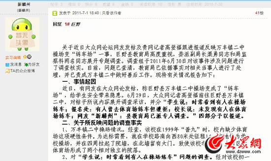 6月28日,大眾網論壇菏澤網友發帖反映了巨野縣萬豐鎮二中操場變“練車場”一事(http://bbs.dzwww.com/viewthread.php?tid=25189630&extra=page%3D1),29日,大眾網記者立即對此事進行了采訪,調查發現確實有人在學校的操場練車(http://www.gaoxiaozai.com/shandong/sdnews/201106/t20110629_6440524.htm)。帖文和稿件發布后,立即得到了巨野縣教育局高度重視,6月30日,教育局立即委派副局長和監察科兩名同志對該事件涉及問題進行調查核實,7月1日下午,巨野縣教育局向本網發來《關于反映萬豐鎮二中操場變“練車場”一事的調查報告》,并繼續以“新麟州”的網名在菏澤論壇發帖,公開回應質疑。