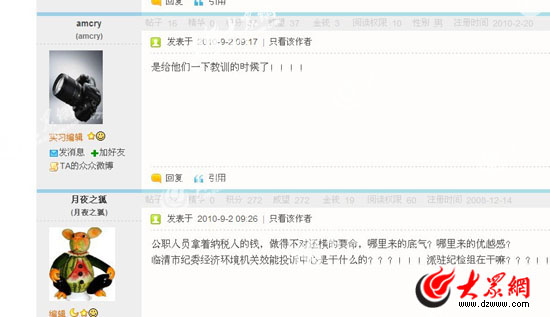 IP地址為“112.241.7.*”的網友跟帖說,“難道這就是文廣局的領導的素質嗎?實在是不敢恭維,我心已死!”;網友“臨清京華”留言說,“臨清文廣新局的工作人員素質這么低啊,還是文廣部門呢。人家樓主說的也是實情啊,為什么這樣對人家。”;“運河淘沙”留言說,“樓主當初發的帖子也是出于愛家鄉文化事業的目的,只是題目欠斟酌。罵人也是出于愛自己的單位,不愿意讓人議論自己單位,在氣頭上帶了粗口。”