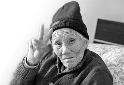 圖二:95歲的董寶英看到記者拍照,向記者比劃剛學來的勝利手勢。