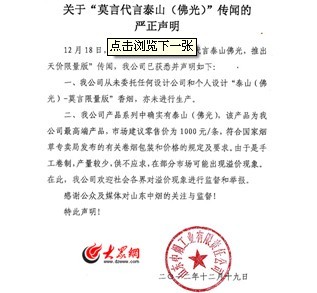 在這份聲明中,山東中煙工業(yè)責(zé)任有限公司表示,該公司從未委托任何設(shè)計(jì)公司和個(gè)人設(shè)計(jì)泰山(佛光)-莫言限量版香煙,亦未進(jìn)行生產(chǎn)。該公司產(chǎn)品系列中確實(shí)有泰山(佛光),該產(chǎn)品為該公司最高端產(chǎn)品,市場(chǎng)建議零售價(jià)為1000元/條,符合國(guó)家煙草專賣局發(fā)布的有關(guān)卷煙包裝盒價(jià)格的規(guī)定及要求。由于是手工卷制,產(chǎn)量較少,供不應(yīng)求,在部分市場(chǎng)可能出現(xiàn)溢價(jià)現(xiàn)象。