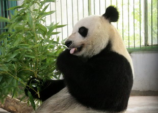 ▲熊貓泉泉生前在濟(jì)南動(dòng)物園大口吃竹子。