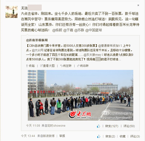 數千球迷在寒風中苦守、排隊半天買不上票、轉手高價坑球迷……今天上午,一條“黃金男籃售票惹眾怒,網友爆料票販子加50萬收票轉手坑球迷”的微博迅速引發熱議,球迷紛紛留言爆料稱,售票窗口買不到票,旁邊黃牛手中有一大把票,價格高好幾倍。同時,在淘寶上,CBA總決賽山東黃金男籃vs廣東東莞銀行的球票標價炒到了1000元。