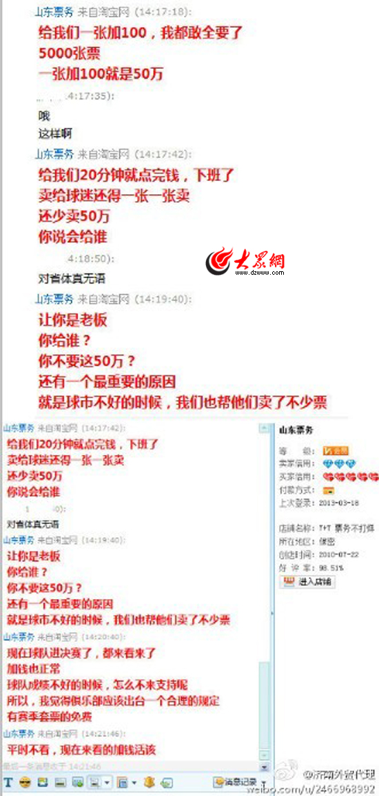“為什么省體不賣票呢?”“在窗口不能加錢。”在網友濟南外貿代理上傳的淘寶聊天記錄中,用戶名為“山東票務”的商家告訴買家,3月19日省體不會開始賣票,該商家提前以一張加價100的價格買了5000張球票,因為票賣給商家20分鐘就點完錢下班了,賣給球迷還得一張一張賣,還少賣50萬。