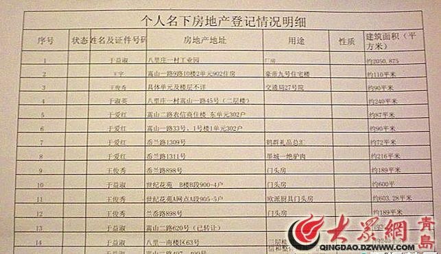 網上曝出的于保成房產明細
