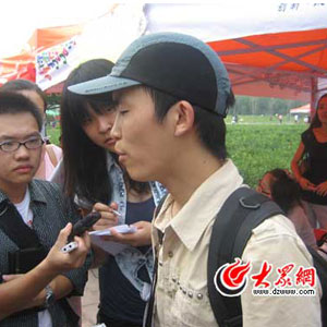 今天上午11:50,大眾網(wǎng)記者驅(qū)車趕到山師長清校區(qū),只見到處是迎新的標(biāo)語和前來報到的學(xué)生。在該校歷山學(xué)院的報到臺前,十幾家媒體記者已經(jīng)在此等候,攝像機(jī)、照相機(jī)等“長槍短炮”已經(jīng)架好,時刻準(zhǔn)備拍攝“保安哥”的一舉一動。