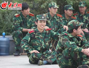 昨天下午4:00,記者來到山師大長清校區(qū)內(nèi),只見這里到處是正在軍訓(xùn)的新生團(tuán)隊,大家都穿著統(tǒng)一的迷彩服,想在人堆里找到賈作勝是件極其困難的事情。在輔導(dǎo)員的特批下,一個新生從一個軍訓(xùn)方陣?yán)镱I(lǐng)出了賈作勝。和9月4日報到時相比,他添了一撇小胡子,臉上變黑了一些,談話也和氣了許多。在旁邊整齊劃一的軍訓(xùn)口號聲中,與他的交流也從他的嶄新的大學(xué)生活開始。