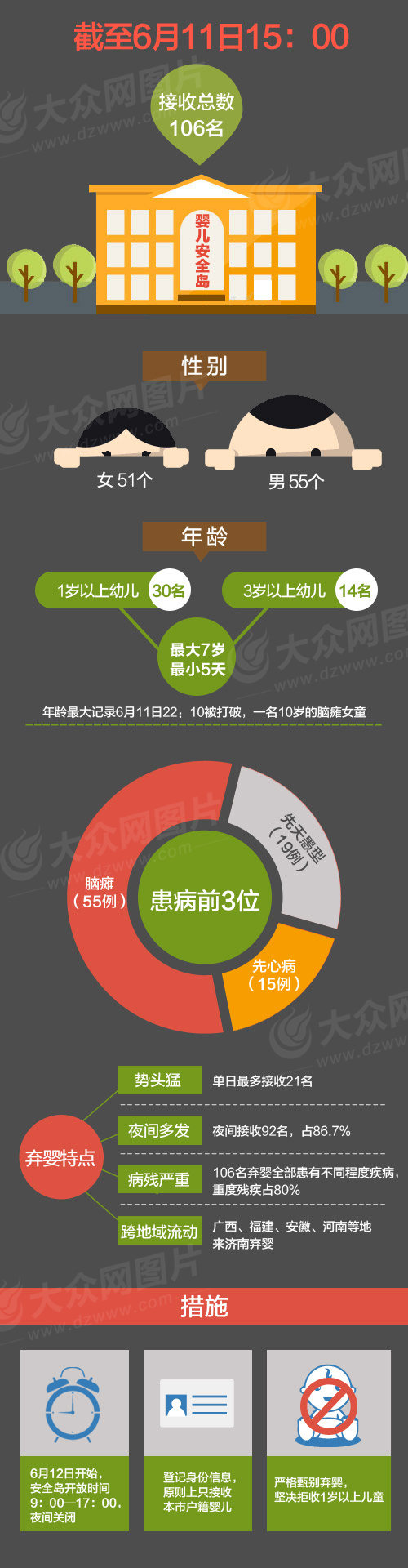 6月11日,濟南市兒童福利院嬰兒安全島在開放11天后,無奈宣布從翌日起夜間關閉,對嬰兒進行實名登記。全天開放11日,濟南棄嬰島共接收棄嬰、孩子超過106人,最大的10歲,最小的僅出生5天,這個數字再次刷新了濟南市兒童福利院往年全年接收棄嬰總量的紀錄。也因為如此高的“熱度”,濟南棄嬰島被推到了輿論的風口浪尖。