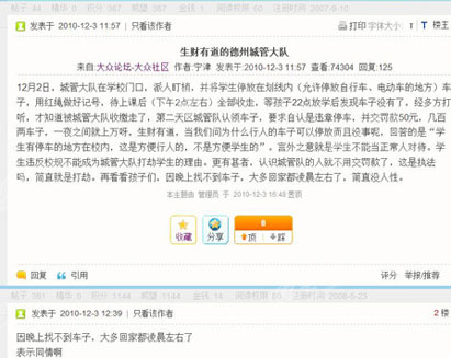 有網(wǎng)友在大眾網(wǎng)德州論壇曝光德州城管對一中校門口的學(xué)生自行車進(jìn)行“收繳”,導(dǎo)致學(xué)生“因晚上找不到車子,大多回家都凌晨了”,網(wǎng)友稱被城管收走的學(xué)生...