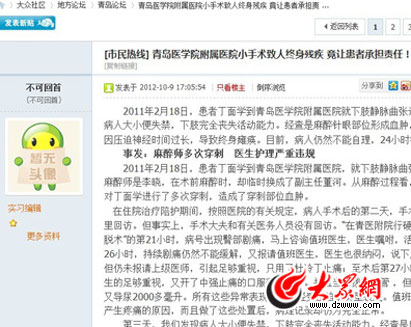 青島醫(yī)學(xué)院附屬醫(yī)院小手術(shù)致人終身殘疾,竟讓患者承擔(dān)責(zé)任?近日,網(wǎng)友在大眾論壇爆料稱,自己的父親去年在下肢靜脈曲張手術(shù)后第三天突然大小便失禁,下肢完...