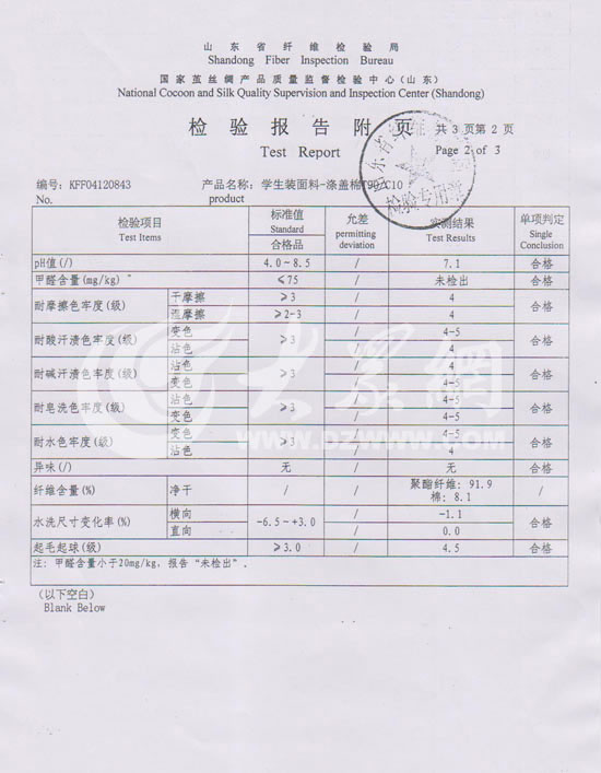 尹相禮也公布了由山東省纖維檢驗局和日照市產品質量監督檢驗所提供的質檢報告,報告上顯示,這批校服的甲醛含量、色牢度、纖維含量、PH值以及可分解芳香胺染料等多項質量指標都是合格的。