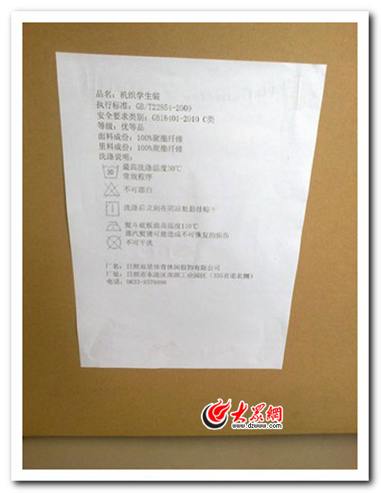 所謂“三無產品”是指無生產廠家名稱、無生產日期、無生產地址。大眾網記者從校服大包裝上的產品標識上看到,廠名為“日照雙星體育休閑服飾有限公司”、地址為“日照市東港區南湖工業園區”,日照市質監局提供的檢驗報告中注明校服生產日期為“2012年12月20日”。