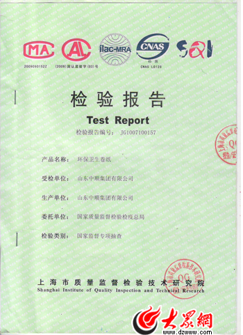 據陳樹法介紹,當拿到國家質檢總局委托檢測的結果后,公司當天便將被抽檢的同一批次的產品主動送檢山東省質檢局,隨后,又將公司生產的卷紙、盒巾、軟抽、面巾紙四大類產品共十幾個品種全部送檢東平縣質檢局以及省質檢總局。