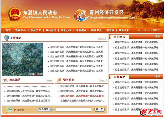 大眾網濟南4月19日訊(記者 王磊)今天上午,大眾網濰坊論壇一則《青州市東夏鎮人民政府網站——洗洗更健康》的帖子(http://club.dzwww.com/viewthread.php?tid=24933939&extra=page%3D1)引發網友關注,被跟帖的網友戲稱為“中國最健康的網站”。網友“MRWF”在發帖中稱,一位網友在網上查閱青州市東夏鎮資料時,無意間走進了這個充滿“喜劇”的網站——青州市東夏鎮人民政府網,該政府網站首頁及“黨務信息”等欄目下文章標題幾乎全是“能水洗的鼠標,洗洗更健康”,而點擊標題后,文章內容則是一篇關于某電子寵物產品的介紹。