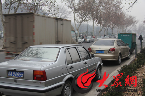 除了快車道堵車嚴重,文化西路部分路段的副道也被當成了露天停車場。12月19日,記者來到文化西路實地探訪時發現,該路從青年東路交叉口往東至歷山路這一段,兩側快車道及副道幾乎沒有亂停車的現象,偶然有也是即停即走。然而從青年東路路口往西,簡直就是一番令人驚訝的場景:快車道兩側都停滿了機動車輛!更為嚴重的是,從省中醫至齊魯醫院附近的路段,不光是兩側快車道,就連副道也被從全省各地來醫院看病的車輛停得滿滿的。
