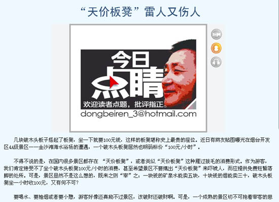 《遼沈晚報》還專門刊發題為《“天價板凳”雷人又傷人》的評論,認為“包括金沙灘海水浴場在內的諸多景區,應加強對景區建設的規劃和服務的管理,別擺出雷人又傷人的‘天價板凳’了。不然,惡劣行徑在現實或網絡里口口相傳后,再想輕輕松松收復游客之心,那就‘亡羊補牢為時晚矣’了!”