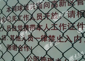 今天下午,淄博網友杜女士向記者發送了一張她在火炬公園內拍攝的照片:一個白色的牌子被掛在鐵絲網內,上面以紅色字樣寫著“本網球場只面向高新區管委會機關工作人員開放,請相關人員自覺攜帶本人工作證件入場。其他人員一律禁止入內。謝謝合作!”,署名為“公園管...