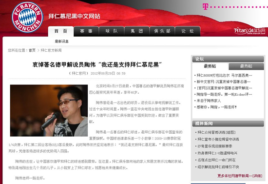 拜仁官網哀悼陶偉:十余年德甲解說作出重要貢獻
