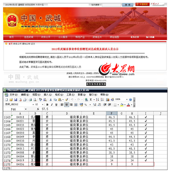 網(wǎng)友“蹦蹦強(qiáng)”貼出的這份名單來(lái)源是哪,是否屬實(shí)?隨后,大眾網(wǎng)記者找到武城縣人民政府網(wǎng)站,在其頁(yè)面上的“通知公告”一欄中,記者找到了“2012年武城縣事業(yè)單位招聘筆試總成績(jī)及面試人員公示”的頁(yè)面并下載了一份總成績(jī)及面試人員名單。