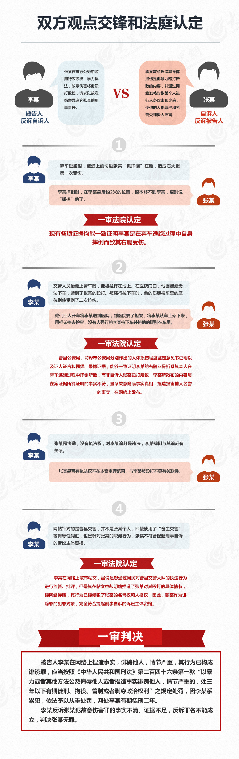 李某:根本不成立。因為誹謗是針對個人誹謗的,任何團體、單位都不能稱為誹謗。我發的所有的帖子,都是針對交警隊暴力執法,在之中提到了某些人。因為交警隊不能打我,交警隊是一個單位,打人的是執法者。我多次提到他們,提到的是他們作為執法者或者執法人員的名字,他穿著“官衣”就是執法者。我跟張某素昧平生,為什么誹謗他?我也不知道打人者有沒有執法的權力,我也不知道他是協警。在他攔下我摩托車的時候,他不會知道我沒有駕照,我只是一個嫌疑人,國家明文規定,對于一個嫌疑人,不允許使用暴力。他在不知道我有沒有駕駛證的情況下追趕我,人處理問題的本能,有人追趕你,你會不會跑?我覺得有人追我,我要跑,這是人的本性。這是一方面。第二方面,我的受傷,無論他在追趕中怎么使我受傷,他們都脫不了干系。他是協警,沒有執法權,來追嫌疑人,是不是違法執法?